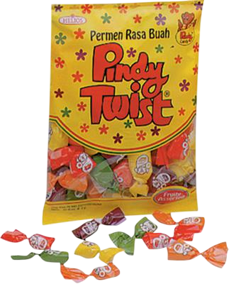 Jika permen lain dibungkus dengan plastik yang dipelintir di kedua ujungnya, permen yang satu ini dipelintir hanya di salah satu ujungnya. Inilah yang membuat Pindi Twist terlihat unik dengan ciri khas gambar beruang di bungkusnya. Pindy Twist adalah favorit bagi mereka yang suka perpaduan rasa unik. Ada yang rasa buah-buahan segar, hingga panduan rasa coklat dan susu.